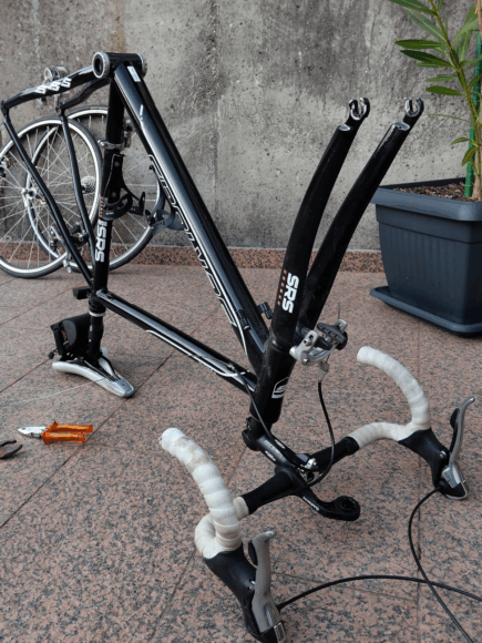 Los geht es. Erstmal die Kette ab, Laufräder raus, Kurbel raus. Diesmal sollte nichts dem Zufall überlassen bleiben. Danach habe ich alle Brems- und Schaltzüge gelöst und aus ihren Führungen genommen. Am Lenker waren die Bremszüge jedoch unter dem Lenkerband verlegt, also musste das ab.